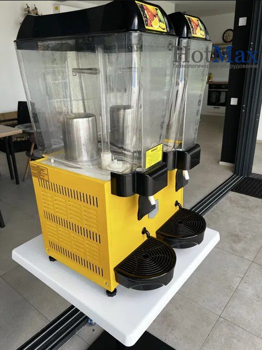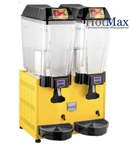Сокоохладитель Remta ST12, фонтанного типа перемешивания. Два бункера по 20 литров. Колбы из прочного поликарбоната. Корпус метал окрашен в желтый цвет. Тихий и экономичный компрессор. Каплесборник. Раздельная регулировка температуры для каждой колбы.