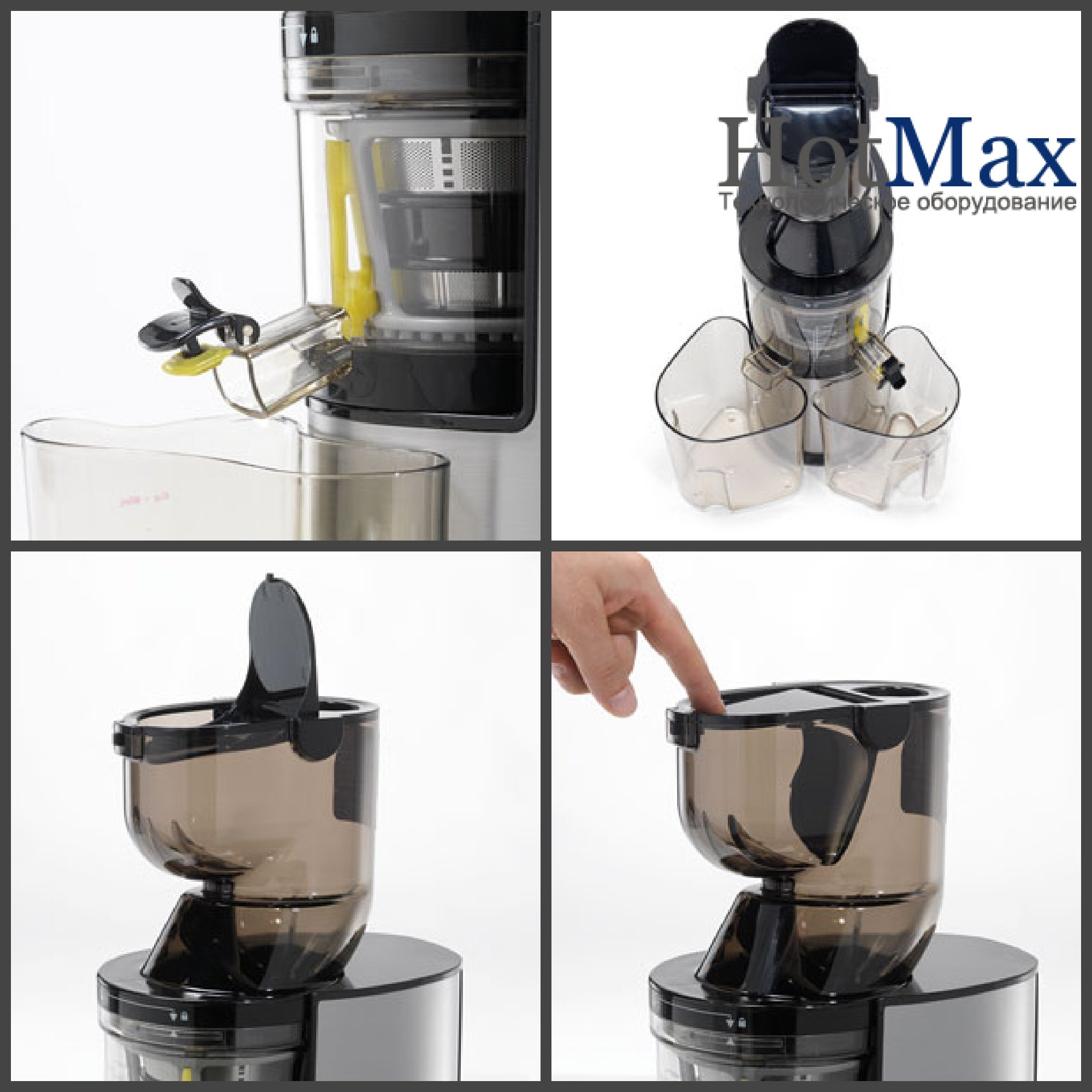 Эффективный шнековый винт. Каплесборник. Легка в обслуживании. Толкатель для легкого продвижения продуктов. Щетка для чистки. В комлекте два лотка: один для сока и один для жмыха. Вентилируемый двигатель.