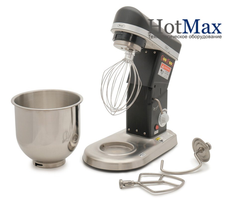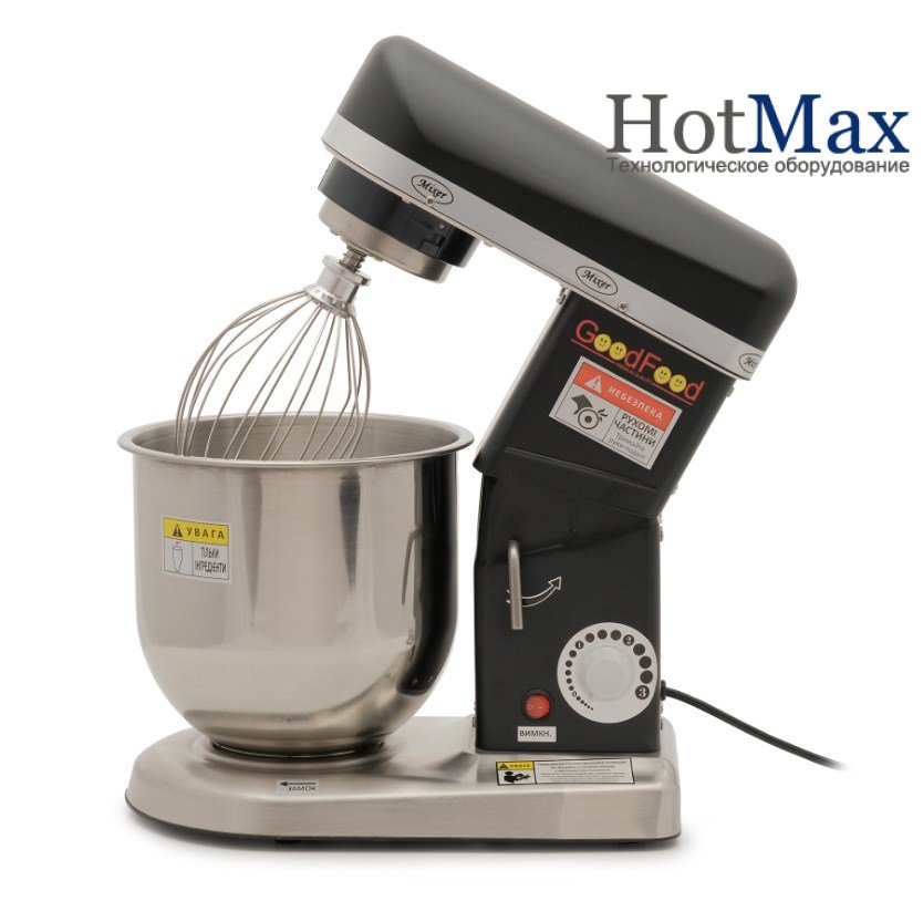 Машина збивальна GoodFood PM-B7 BLACK (чорний колір корпус) - високошвидкісна збивальна машина з діжою 7 л, голова міксера може підніматися, плавне регулювання швидкості, швидкість обертання насадки навколо своєї осі 0-1000 об/хв, швидкість обертання насадки по периметру діжі 302 об/хв. У комплекті аксесуари: вінчик, лопатка, гак. Металевий корпус пофарбований в червоний колір. Потужність двигуна 500 Вт, захист від перевантаження, напруга 220 В. Додаткова опція: захисна сітка.