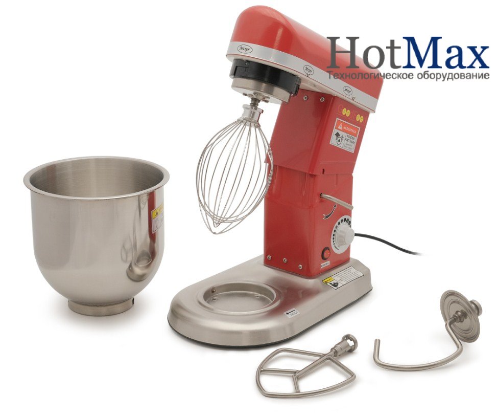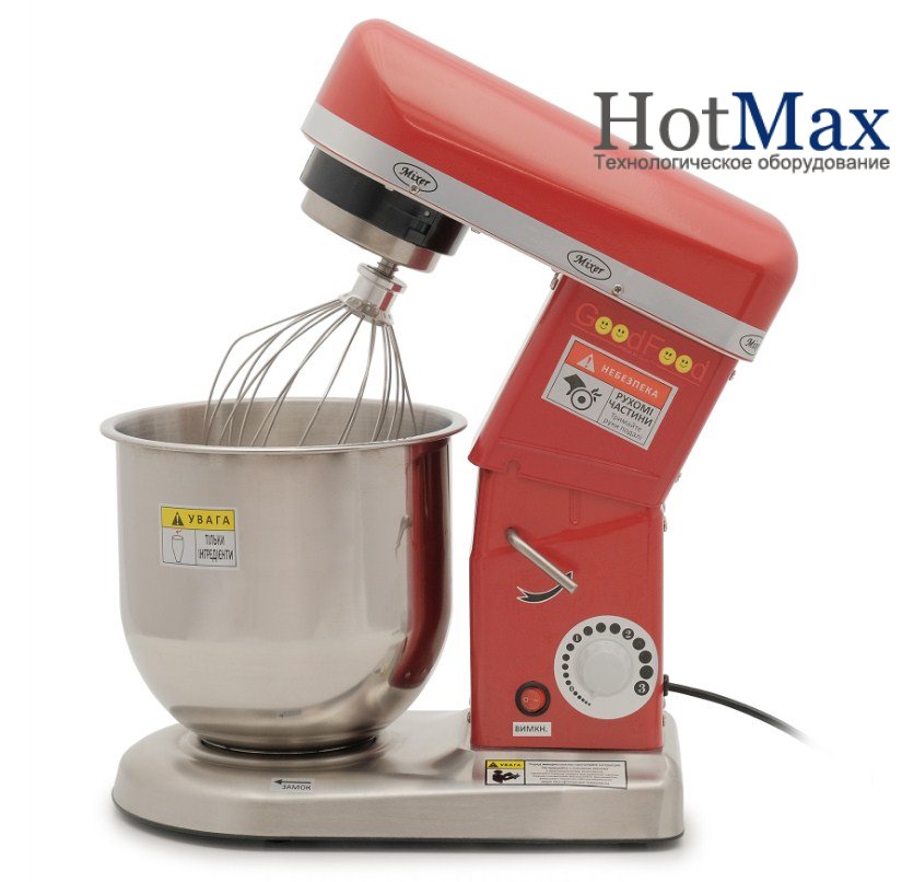 Машина збивальна GoodFood PM-B7 RED (червоний корпус) - високошвидкісна збивальна машина з діжою 7 л, голова міксера може підніматися, плавне регулювання швидкості, швидкість обертання насадки навколо своєї осі 0-1000 об/хв, швидкість обертання насадки по периметру діжі 302 об/хв. У комплекті аксесуари: вінчик, лопатка, гак. Металевий корпус пофарбований в червоний колір. Потужність двигуна 500 Вт, захист від перевантаження, напруга 220 В. Додаткова опція: захисна сітка.