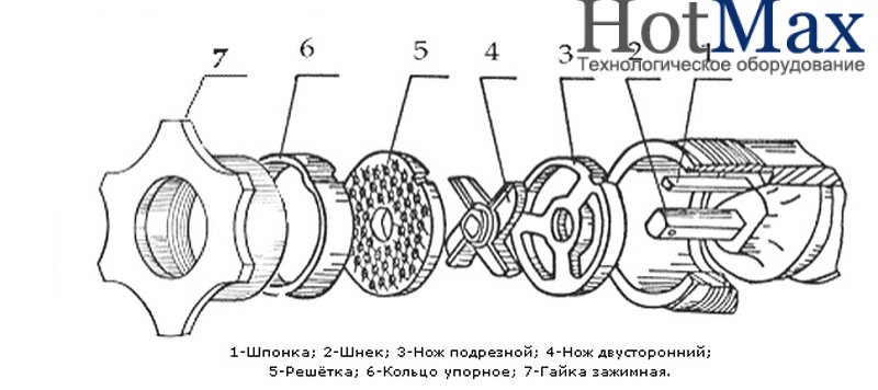 Мясорубка, состоит из алюминиевого корпуса,в котором вращается шнек, зажимной гайки, двусторонних ножей, набора ножевых решеток,упорное кольца и подрезной нож.
