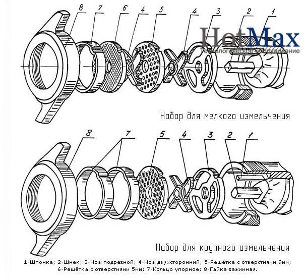 Мясорубка, состоит из алюминиевого корпуса,в котором вращается шнек, зажимной гайки, двусторонних ножей, набора ножевых решеток,упорное кольца и подрезной нож.