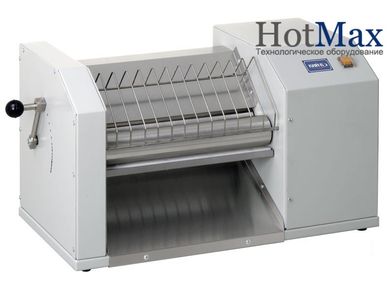 Данная модель тестораскатки предназначается для раскатки теста, посредством его прокатывания между валиками несколько раз. Тесто подается сверху на валики. Благодаря ступенчатой фиксации зазора, обеспечивается точная и быстрая настройка валиков тестораскатки. Конструкция тестораскатки полностью безопасна, так как предусмотрена решетка, исключающая травму рук в процессе работы. Равномерное и качественное посыпание теста мукой обеспечивает просеиватель для муки. Данная модель применяется в фастфудах и общепите.