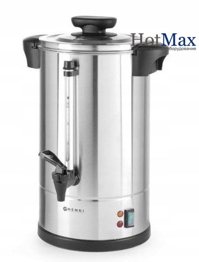 Кофераздатчик Hendi 211335 - кипятильник предназначенный для приготовления кипяченой воды, которая в дальнейшем будет использоваться предприятиями общепита для приготовления кофейных напитков. Кипятильник электрический Hendi 211335 - аппарат периодического действия, который нуждается в повторном заполнении емкости водой. Цилиндрический корпус промышленного кипятильника Hendi 211335 состоит из однослойных стенок, которые выполнены из нержавеющей стали AISI 18/10, характеризующейся высокой кислотостойкостью и коррозиестойкостью.