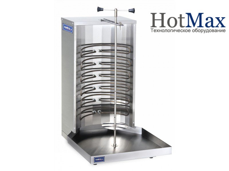Аппарат для шаурмы с ручным вращением шампура и электроприводом предполагает регулировку расстояния между нагревательным элементом и вертелом, что расширяет технологические возможности приготовления блюд. В данном аппарате используются инфракрасное излучение, что придает мясу нежный вкус. Снимаемый поддон обеспечивает сбор жира, благодаря чему облегчается санитарная обработка устройства.