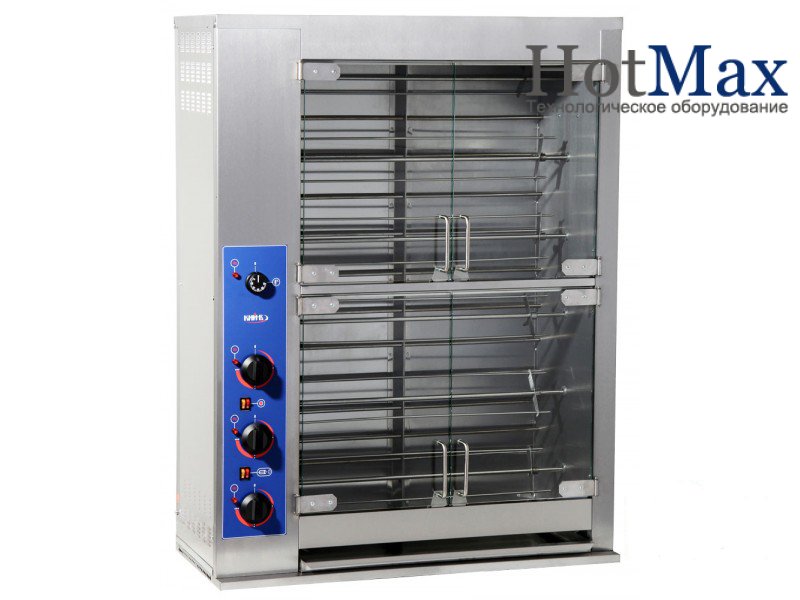 Экономичный и компактный этот гриль для приготовления кур может быть идеальным решением для Вас. Каждый из шампуров имеет персональный привод. Благодаря тому, что двери и задняя стенка выполнены из стекла и Вы и покупатель имеете возможность наблюдать за процессом приготовления блюда. А термостойкое стекло защитит от горячего воздуха. Температура внутри камеры поддерживается автоматически. Данная модель имеет регулятор температуры, внутреннюю подсветку, емкость для сбора жира. Гриль произведен из пищевой нержавеющей стали.