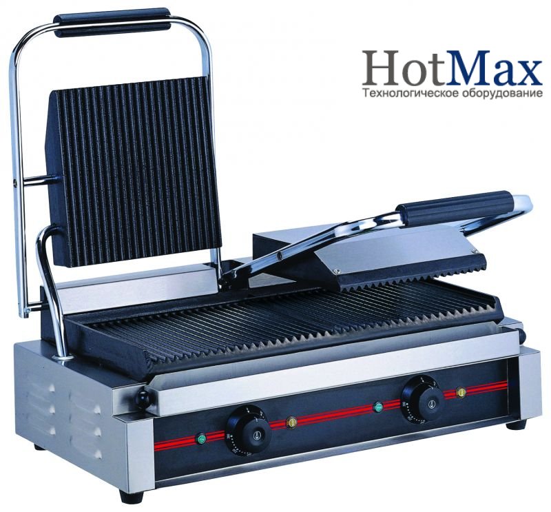 Благодаря двум независимым друг от друга рифленым прижимным поверхностям, выполненных из чугуна, обеспечивается быстрое (в течение нескольких минут) и равномерное приготовление продуктов. Размеры рабочих пластин равны 475х230мм и благодаря их автономности имеется возможность одновременно готовить самые разные блюда, не боясь смешения их вкусов и запахов.