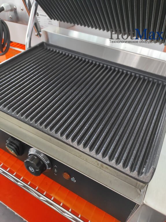 Панель управления электромеханическая: поворотный регулятор мощности нагрева, кнопка вкл/выкл, индикатор нагрева. Специальный противовес исключит произвольное закрытие крышки во время работы оборудования. В данной модели предусмотрена защита от перегрева. Удобная ручка из термостойкого материала защитит повара от получения ожогов.