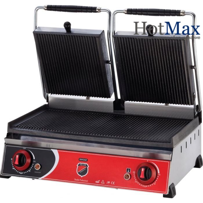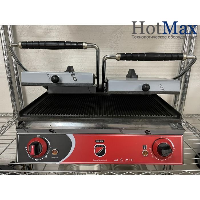 Рабочая поверхность чугунная, ребристая. Верхняя рабочая часть гриля регулируется под углом и толщиной продукта. Контактный гриль оснащен поддоном для сбора отходов.