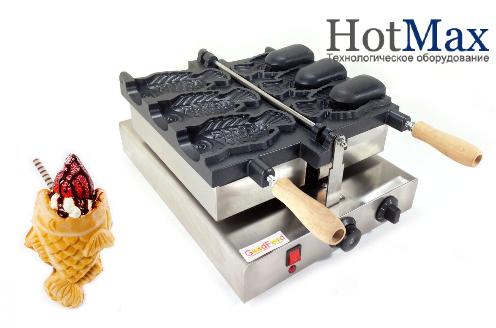 Вафельница GoodFood CREAM FISH WB3C0F (3 рыбки) - электрическая профессиональная вафельница на три объемные вафли 145х100мм в форме пустотелой "рыбки". Нагрев одновременно с верху и снизу. Устойчивое основание. Таймер 5 мин. Форма вафли: рыбка, внутри пустотелая, для заполнения мороженым, размером 400х500х275 мм.