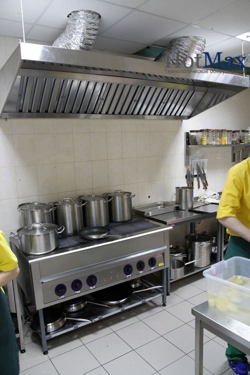 Вентиляционный зонт - предназначен для очистки воздуха от масла, жира водяного пару. Вентиляционные зонты устанавливаются над любым видом теплового оборудования. Принцип работы вытяжного зонта достаточно прост - разогретый воздух с парами масла и жира всасывается в вентиляционный зонт, при прохождении сквозь фильтр зонта он ударяется о стенки фильтра, имеющего лабиринтную структуру, вследствие температурного перепада масло и жир конденсируется и отделяется от воздуха. В дальнейшем масло стекает по герметичному сливному каналу в накопительные стаканы.