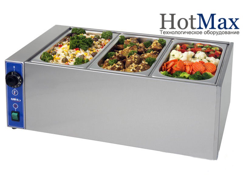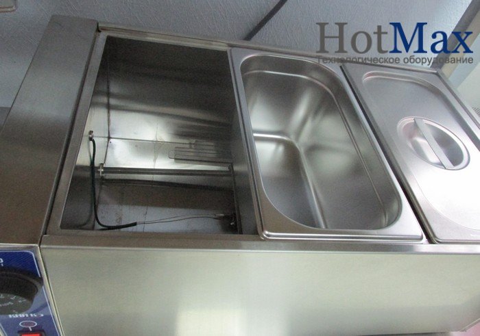 Принцип работы мармита - паровая баня. Данный принцип заключается в том, что налитая в емкость вода подогревается ТЭНом, а образующийся при этом пар постоянно подогревает блюдо. Мармит оснащен термодатчиком, который позволяет контролировать температуру блюд в гастроемкостях.