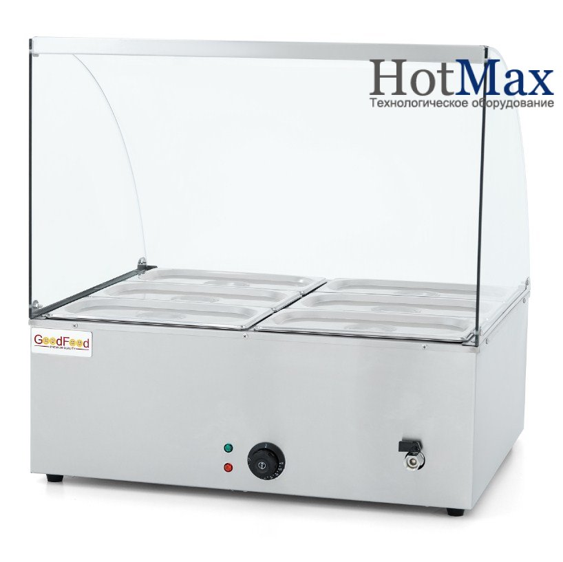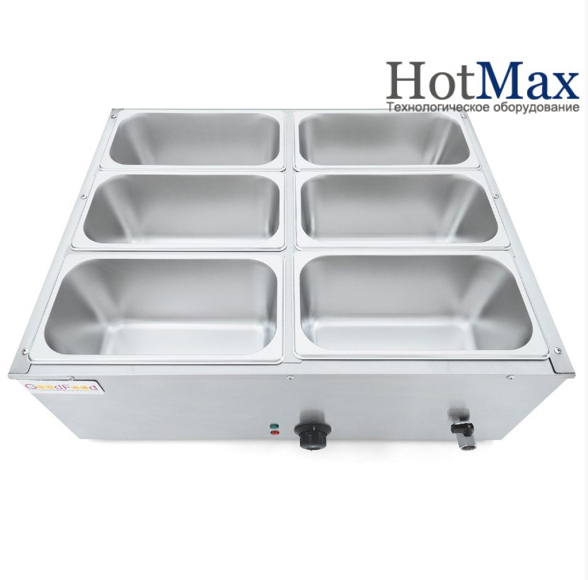 Гастроємності та кришки в комплекті. Наповнення водою – вручну. Зливний кран. Автоматичний термостат.