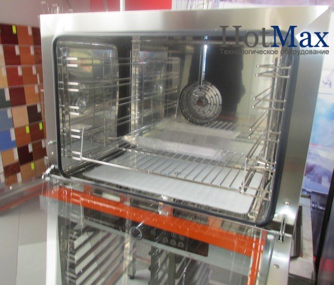 Имеется возможность программирования до 20 программ, каждая из которых разбита на 3 этапа для удобства приготовления сложных блюд. Равномерное приготовление обеспечивается при помощи мощных высококлассных реверсных вентиляторов, с помощью которых воздух по камере циркулирует непрерывно по всей рабочей камере. Рабочая камера условно поделена на 5 уровней, расстояние между направляющими предусматривается 75 мм. Размеры гастроемкостей, используемых при приготовлении блюд, равны 530х325 мм. Противни не вкл в стандартную комплектацию.