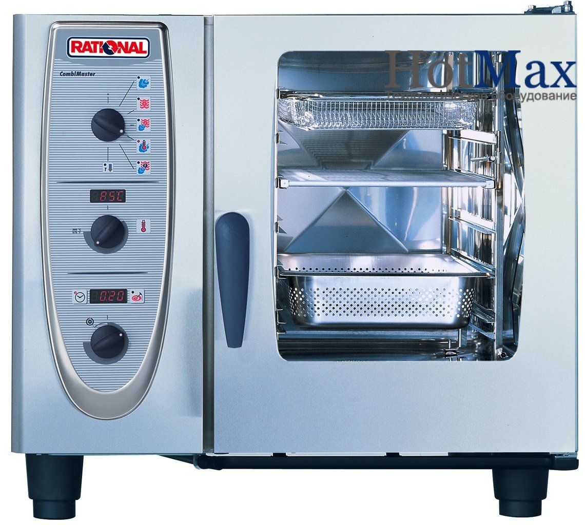 Пароконвектомат CombiMaster 61 – это одна из самых простых пароконвекционных печей RATIONAL, имеющая 5 режимов работы: приготовление на пару (при температуре +100 С), конвекционный режим (от +30 до +300 С), комбинированный режим (от +30 до +300 С), режим низкотемпературного пара (от +30 до +99 С), регенерация приготовленных блюд. Тип парообразования – бойлерный, наиболее распространенный. Вода быстро нагревается в парогенераторе, расположенном во внутренней части печи, закипает, испаряется и поступает через специальный клапан в рабочую камеру.