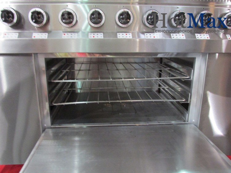 Данная плита промышленного типа изготавливается с чугунными накладками на конфорки. Размеры конфорок составляют - 300х300мм.