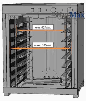 Расстоечный шкаф с ШР-9 имеет габаритные размеры 660х750х980 мм, и предполагается использования гастроемкостей 365х460,460х330,435х320,442х325,450х340,440х315 430х345,435х330,GN 1/1,600х400мм. Диапазон регулирования направляющих: от 424 до 535 мм. Расстояние между направляющими равно 80 мм. Глубина направляющих: 620 мм. Благодаря стеклянным дверцам с уплотнителями можно наблюдать и контролировать процесс работы расстоечного шкафа.