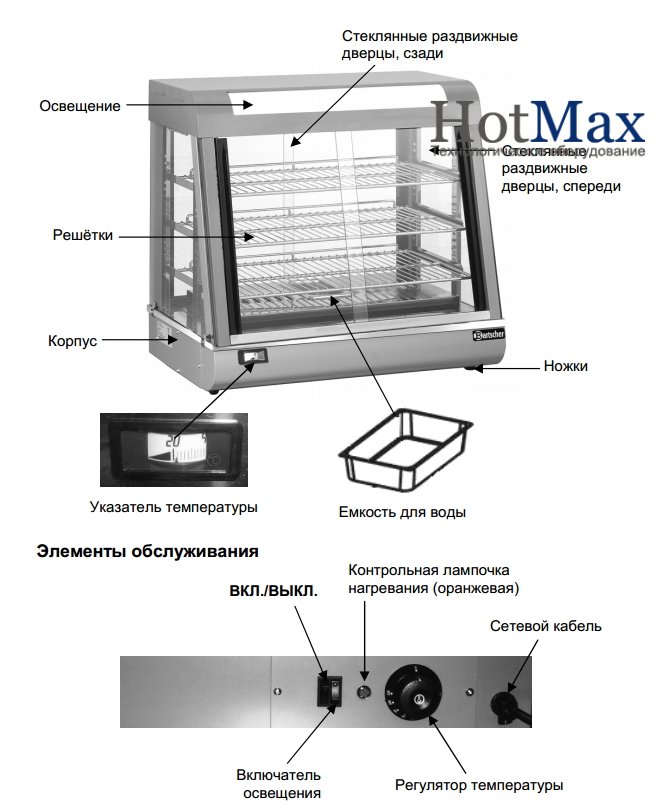 Необходимая рабочая температура устанавливается посредством регулятора температуры, который располагается на задней части устройства. Диапазон рабочих температур лежит в пределах от 0 до +90 С. Если происходит изменение температурного режима в процессе работы витрины, то включатся сигнальная лампочка, после чего обогрев включается вновь в автоматическом режиме. В данной модели реализована функция увлажнения. Для удобства эксплуатации как спереди, так и сзади имеются стеклянные раздвижные дверцы.