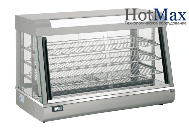 Габаритные размеры тепловой витрины составляют 900х480х590 мм, объем – 152 л, вес равен 52 кг. Потребляемая мощность равна 1,84 кВт. Рабочая камера рассчитана на 3 уровня для выкладки продуктов. Размеры каждой решетчатых полок равны 820х360, 820х340 и 820х315 мм. Витрина оснащена функцией увлажнения, имеется резервуар для воды.