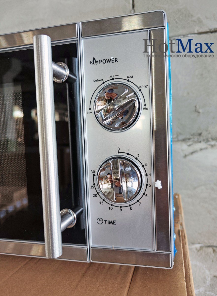 - Електромеханічна панель керування, що регулює час, температурний режим та рівень потужності приготування.