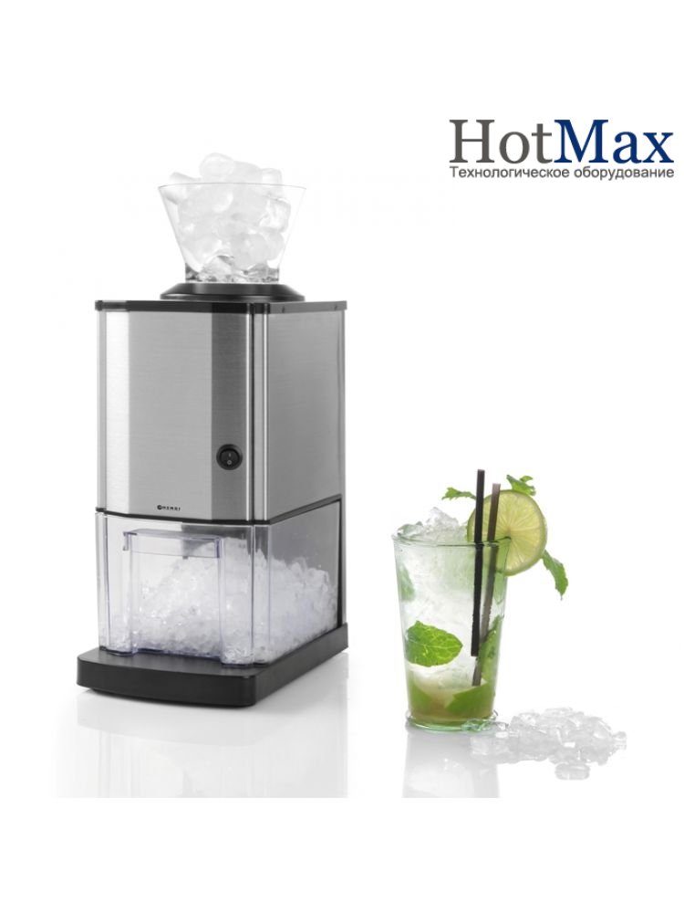 Корпус из шлифованной нержавеющей стали. Широкий лоток для льда из ABS-пластика. Прочный механизм для измельчения льда с ножами из нержавеющей стали. Прозрачный бункер с макс. ёмкостью равной 12 стаканам измельчённого льда (около 3 л). Производительность: до 12 кг/ч. Не предназначена для непрерывной работы. Делает мелкую крошку.