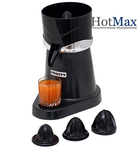Соковыжималка Frosty CJ4 для цитрусовых электрическая с ручным прижимом. Корпус - метал окрашеный. Контейнер для сока и насадки - из пластика. Оснащена дополнительными насадками для лимонов. Устройство не предназначено для непрерывного использования.