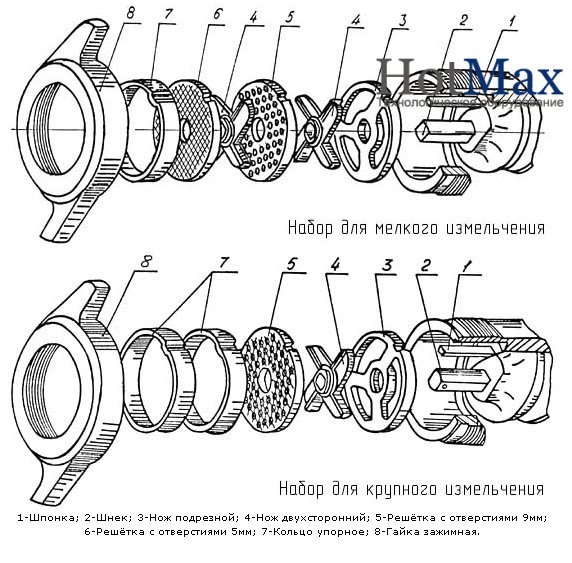 Мясорубка, состоит из алюминиевого корпуса, в котором вращается шнек, зажимной гайки, двусторонних ножей, набора ножевых решеток,упорное кольца и подрезной нож.