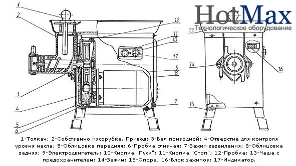 Мясорубка, состоит из алюминиевого корпуса,в котором вращается шнек, зажимной гайки, двусторонних ножей, набора ножевых решеток,упорное кольца и подрезной нож.