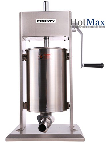 Професійний шприц для набивання ковбас FROSTY SV-10 обсягом 10 літрів. Привід механізму - ручний. Поршень з клапаном для повітря. Пріготовленний на професійній м'ясорубці фарш завантажується в бункер. Фарш видавлюється поршнем. На кінці знаходиться воронка, на яку надівається оболонка для ковбаси.