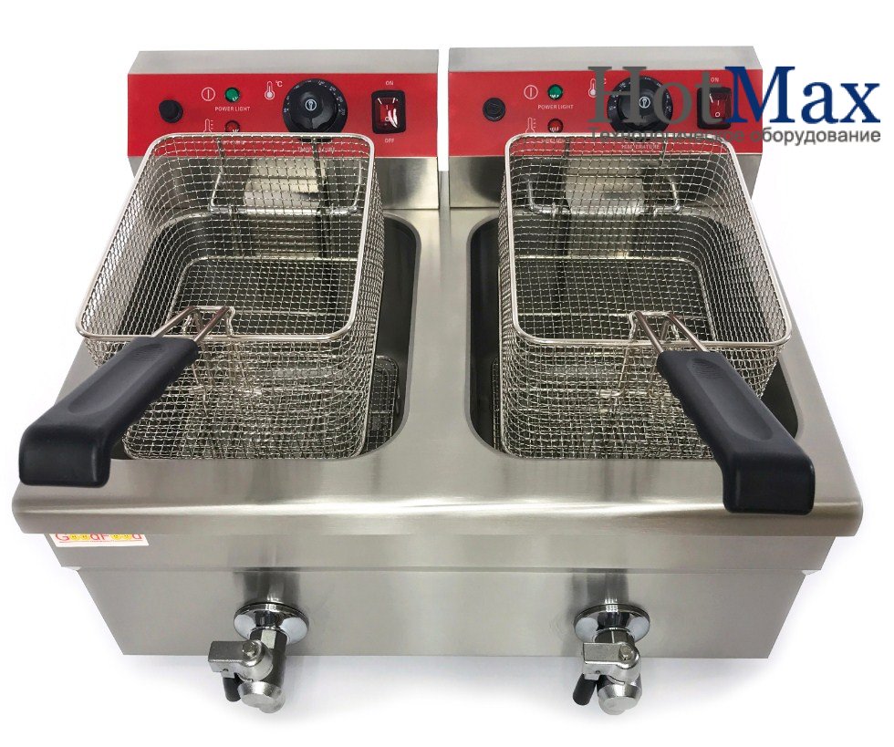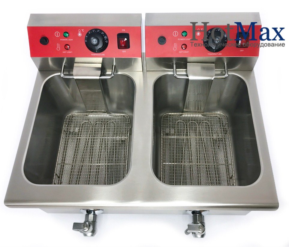 Загальний об'єм 12л+12л. Корпус, кришка, панель управління, ванна та кошик із харчової нержавіючої сталі. Кран для зливу олії. Регулювання температури нагрівання олії 60-200С. Місткий кошик із зручною ручкою. Розмір кошика: ???х???(???)х???мм. Тип установки: встановлення на столі. Гумові ніжки. Потужність: 3,25 кВт+3,25 кВт.