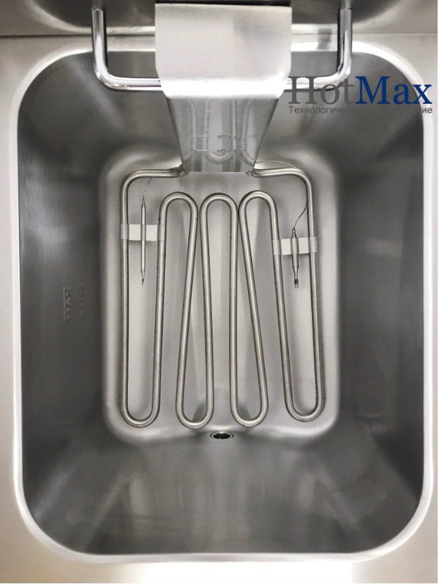 Корпус, крышка, панель управления, ванна и корзина из пищевой нержавеющей стали. Кран для слива масла.