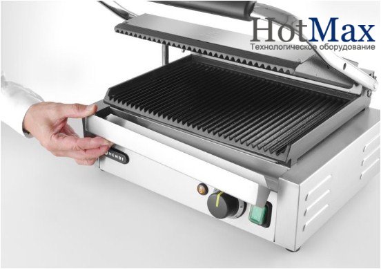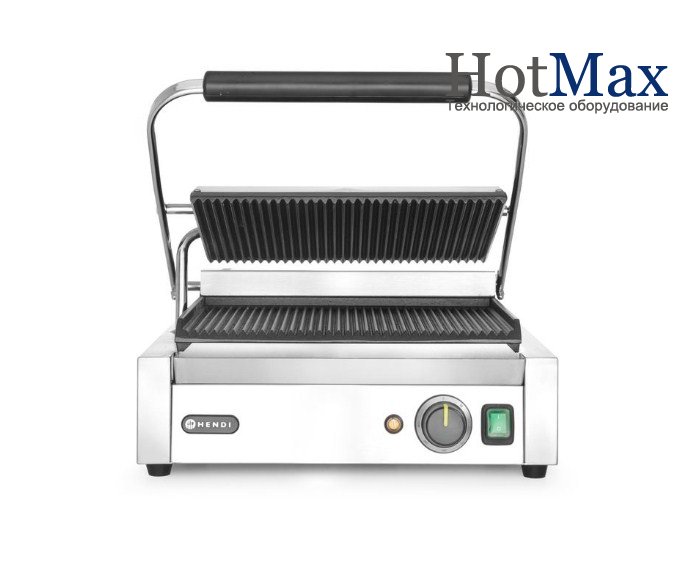 Гриль прижимной (контактный) с рифленой верхней и нижней поверхностями Hendi предназначен для жарки мяса, сосисок, рыбы, а также для разогрева бутербродов, сэндвичей, панини.