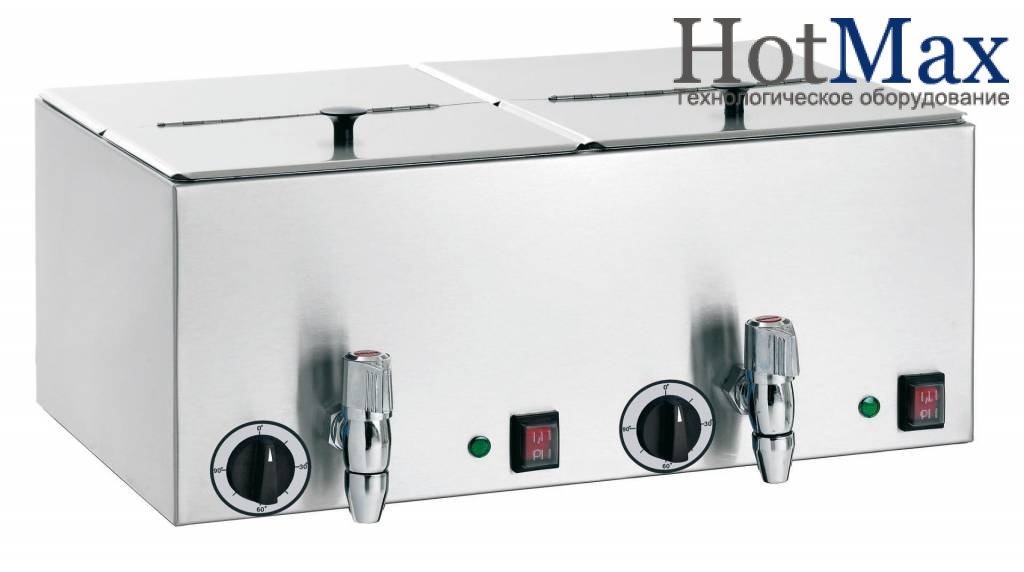 Сосисковарка Bartscher (Барчер) A120.456 - электрическое устройство с 2 раздельными ваннами, которое используется на предприятиях общественного питания для подогревания сосисок. Прибор изготовлен из нержавеющей стали, оснащен откидными крышками и кранами для слива воды из каждой ванной. На лицевую панель выведены регуляторы температуры и контрольные лампочки.