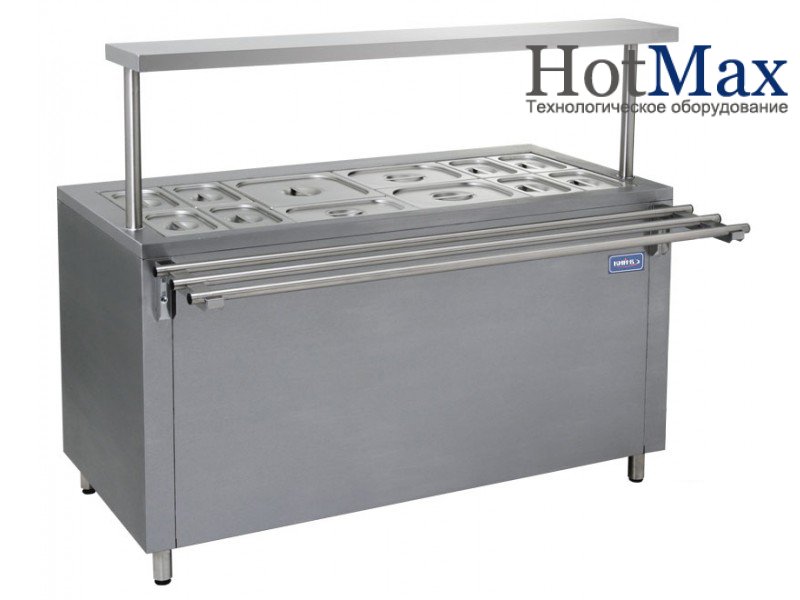 Мармит напольный 2-х блюд М 2Б - 1445К (12 гастроемкостей - 8 х GN 1/4 (100 мм), 2 х GN 1/2 (100 мм), 1 х GN 1/3 (100 мм), 1 х GN 2/3 (65 мм)) – предназначен для хранения вторых блюд в горячем состоянии. Гастроемкости располагаются над конфорками, которые постоянно подогревают содержимое, при этом сохраняя его горячим.