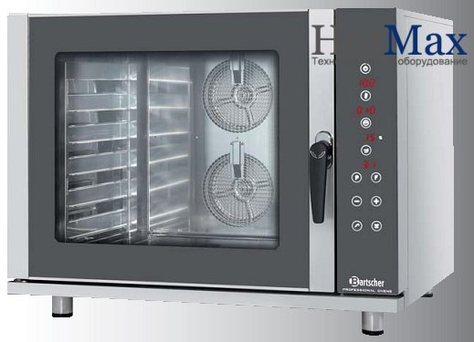 Остекление двери и внутреннее освещение дает возможность наблюдать и визуально контролировать процесс приготовления. Оснащается печь дверцей с двойным стеклом, между внутренним и внешним стеклом постоянно циркулирует охлаждающий воздух, что сводит к минимуму эмиссию тепла во внешнюю среду и возможность получения ожогов обслуживающим персоналом. Максимальная температура достигает порядка 270 С. Процесс приготовления можно вести в одном из трех режимов: конвекции, пара и в комбинированном режиме – конвекции и пара. Неоспоримым преимуществом является наличие программируемого блока, в памяти которого может быть «вшито» до 20 программ приготовления разных блюд. Комплектуется этот пароконвектомат 2 решетками и 2 противнями из нержавеющей пищевой стали.