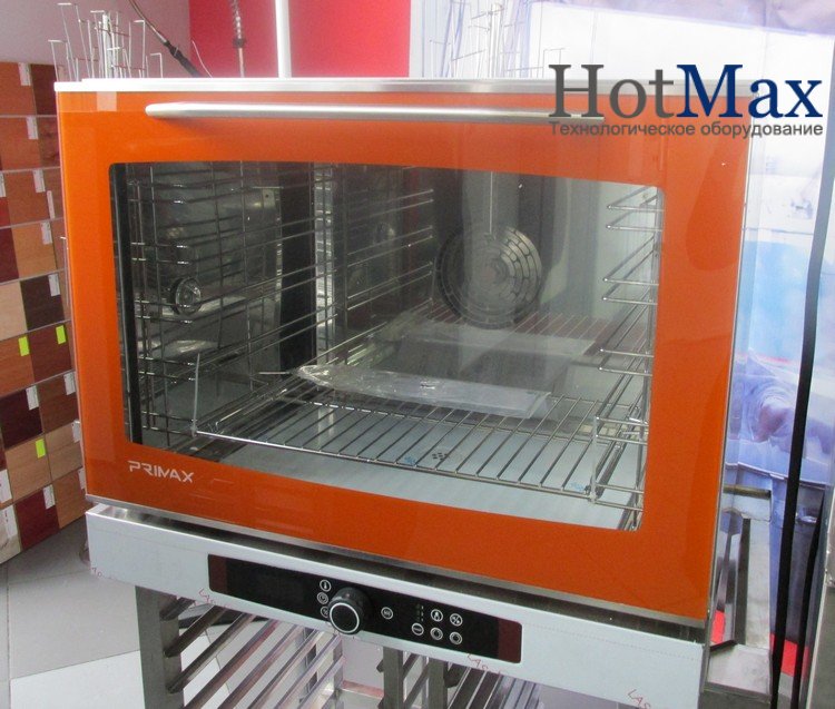 При своих габаритных размерах 780х680х690 мм весит эта печь 116 кг, потребляемая мощность равна 6,3 кВт.  Тип управления – электронное. Подключается пароконвектомат Primax к водоснабжению диаметром подводящей трубы ¾ дюйма.