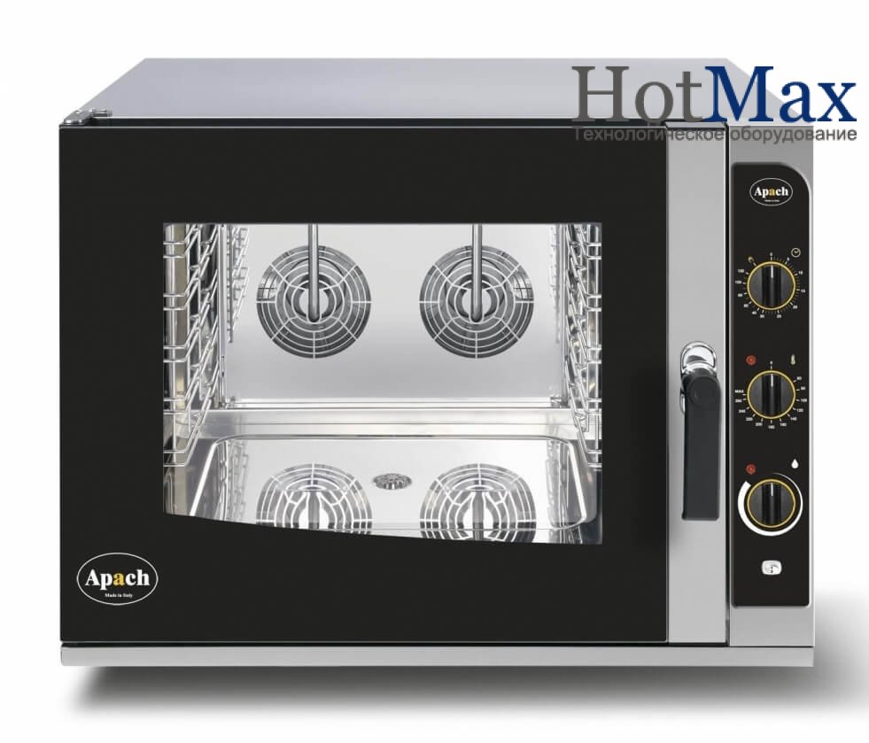 Конвекційна піч Apach AP5QM поєднує в собі відразу кілька видів пристроїв, призначених для теплової обробки продуктів, що дозволяє істотно економити фінанси і займану площу на кухні. Рекомендується до застосування в ресторанах, кафе, пекарнях та інших установах громадського харчування, переважно малого і середнього форматів.