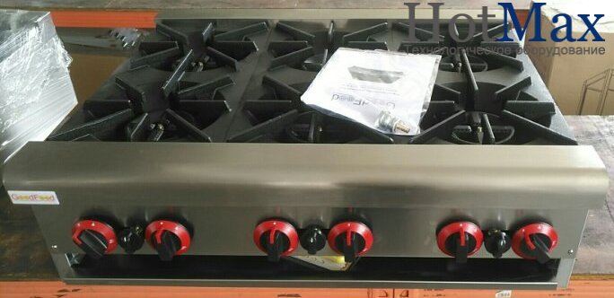 Газова промислова плита виготовлена з нержавіючої сталі. Має 6 економічних пальників швидкого розігріву dх156мм по 32,925 МДж. Накладки на конфорки виготовлені зі сплаву чавун/латунь з високим ККД. Грати виготовлені з товстого чавуну, таким чином витримують велику вагу посуду.