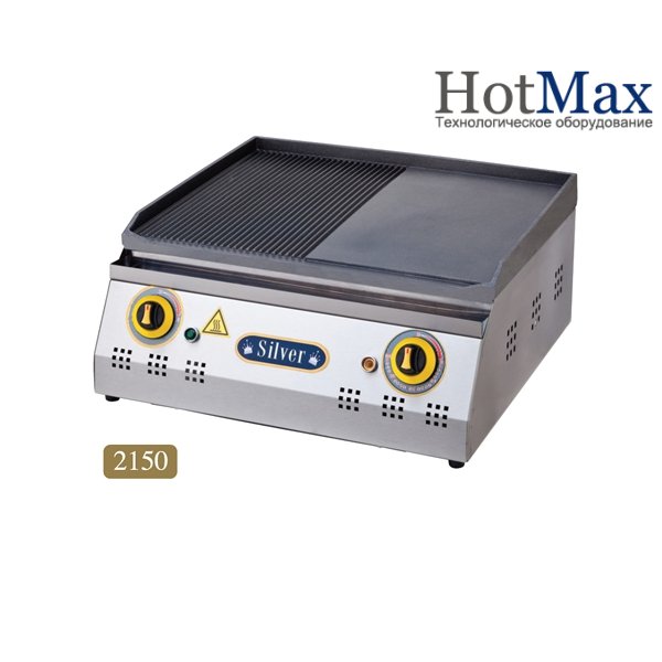 Поверхность жарочная SILVER 2151 - комбинированная, 1/2 ребристая, а 1/2 гладкая, разм. рабочая поверхн. 680х400 мм, чугун, регулятор мощности, tº = +50/+300°C. Материал корпуса: нерж.сталь.