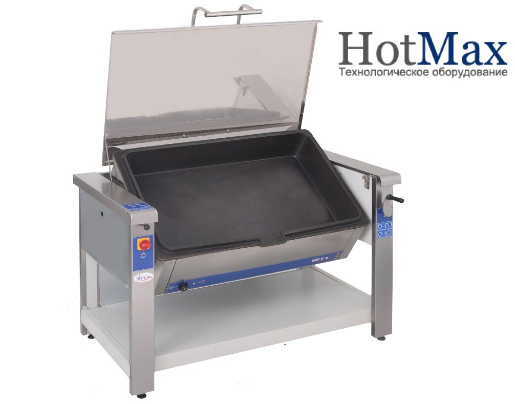 - Для підтримки та зливу жиру чаша сковороди оснащена ручним механізмом перекидання, розташованим на передній панелі. Обертання рукоятки передається через редуктор, що значно полегшує перевертання чаші.